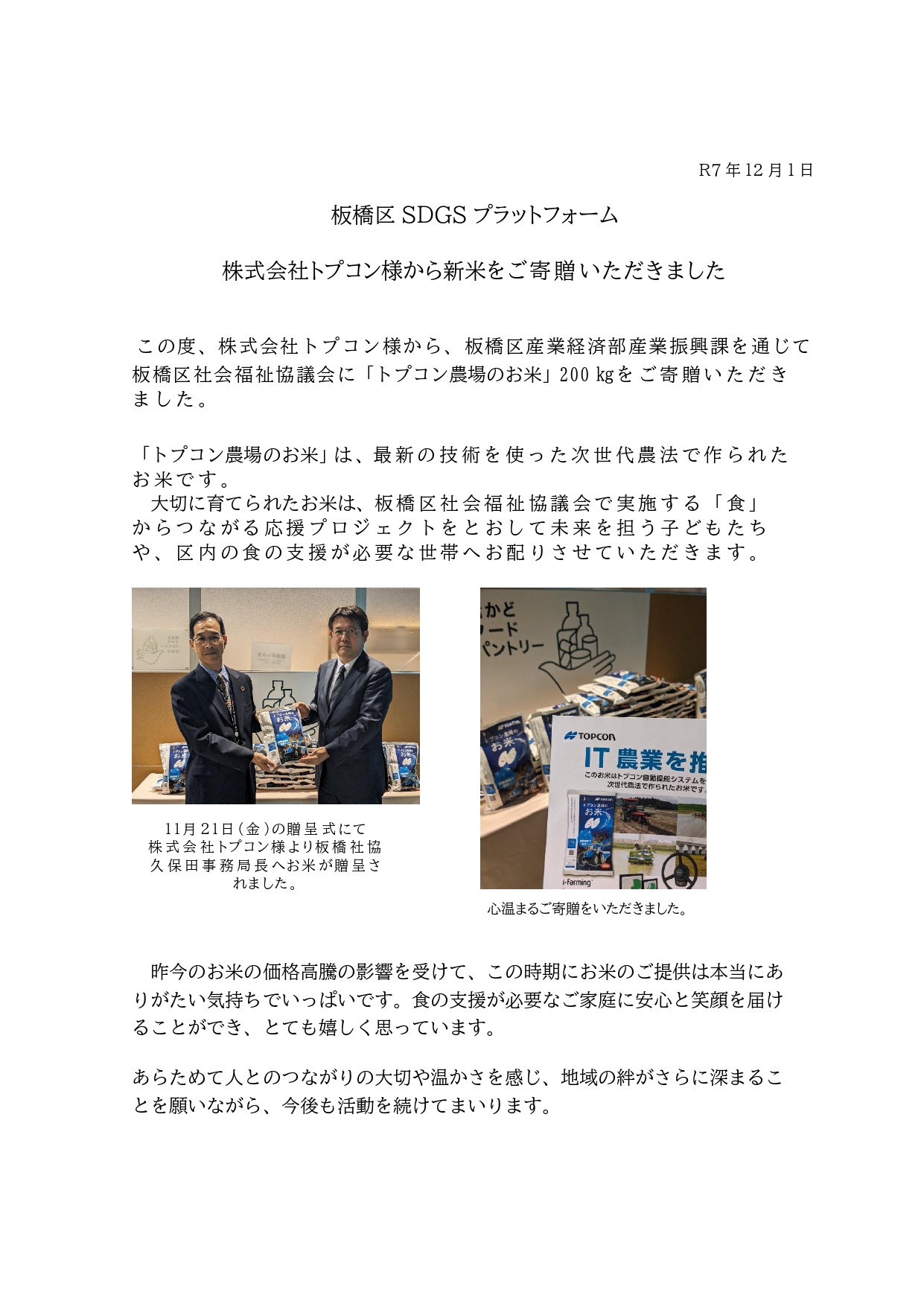 2025/12/05NEW!【御礼】株式会社トプコン様から新米をご寄贈いただきました!